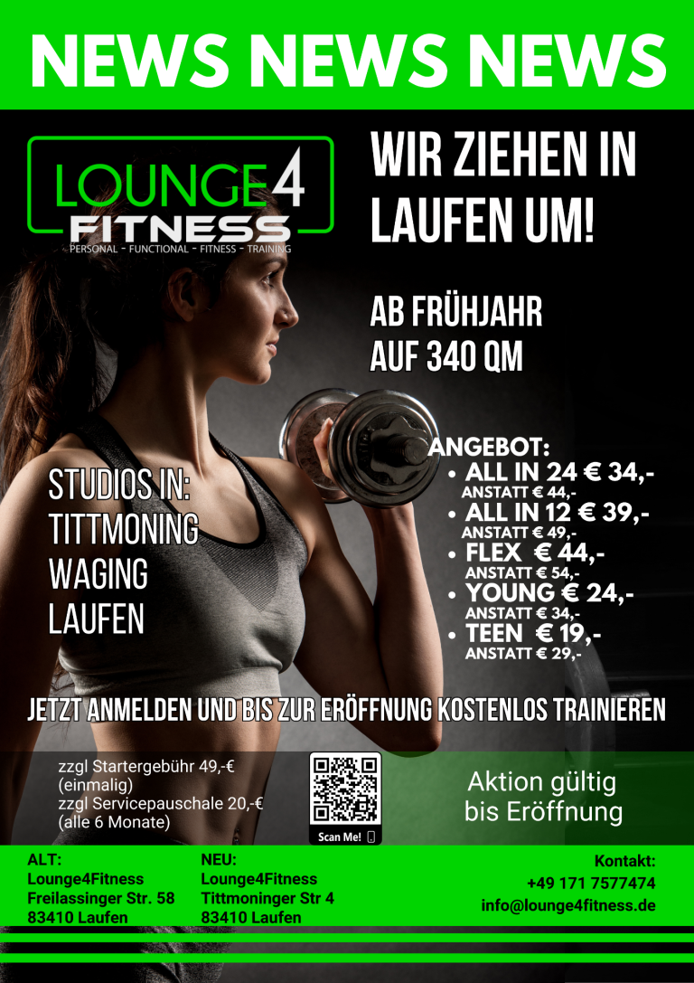 Jetzt anmelden und beitragsfrei bis zur Eröffnung des neuen Studios gleich im "alten" noch trainieren - oder an einem der anderen Standorte. Waging oder Tittmoning.